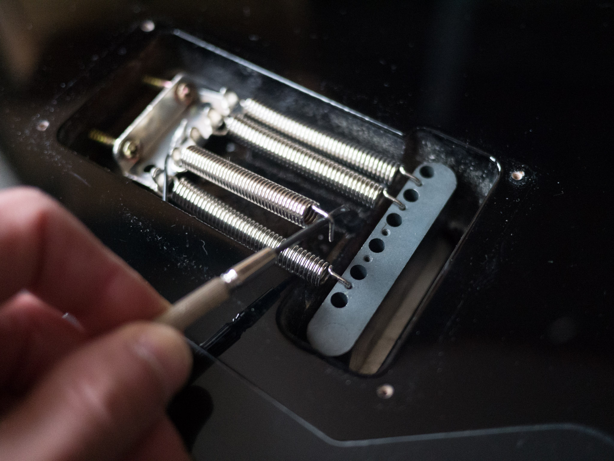 Then, I inserted this spacer between the tremolo block and the wood edge of the body cavity, tightened the springs a few turns to clamp the spacer in place, and then replaced the center spring.