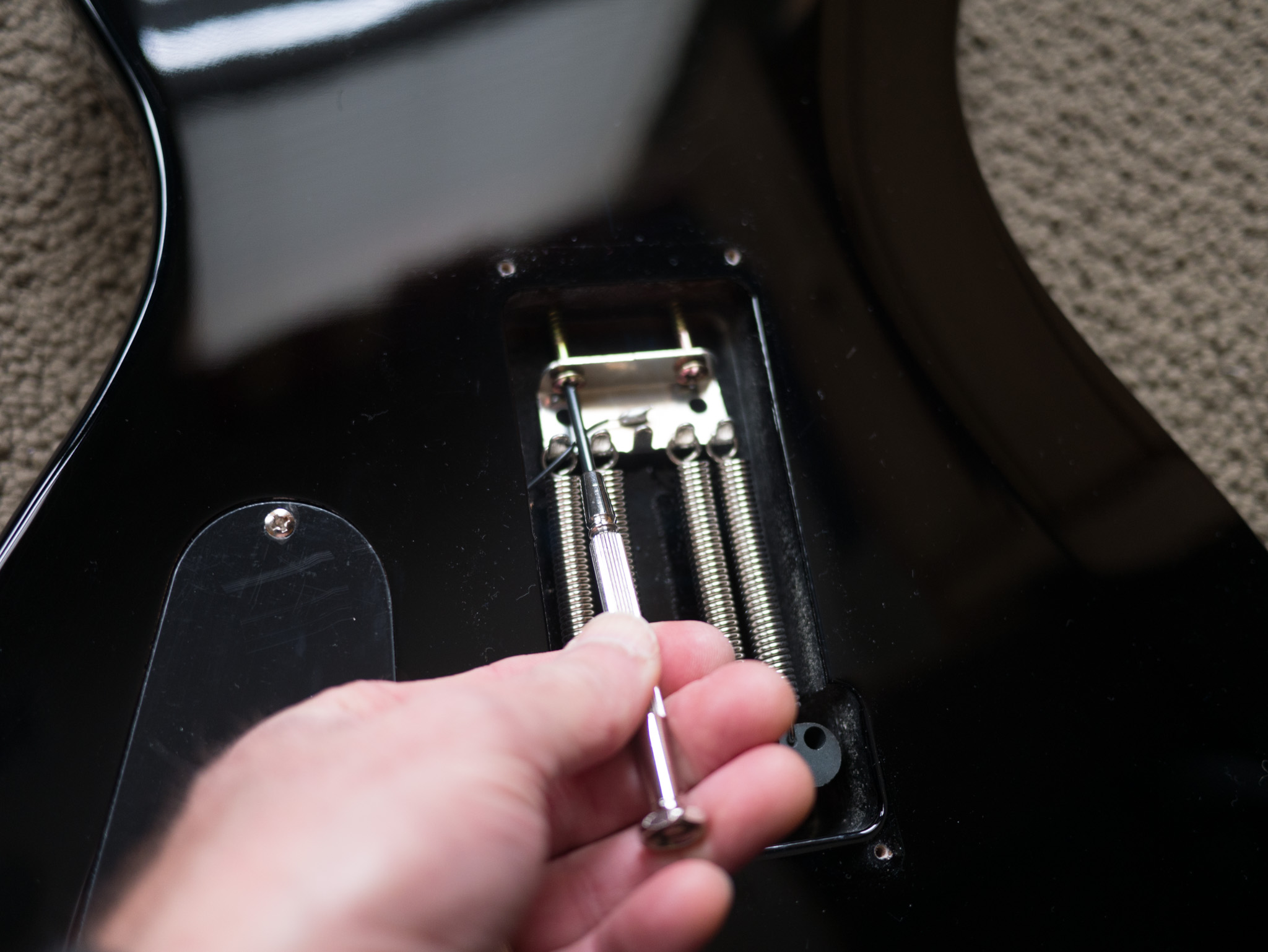 As an experiment, I decided to try to block the tremolo. There are a few ways to do that- the first approach prevents the bridge from bending up, and only allows bending down. This supposedly improves tuning stability and sustain. You accomplish this by inserting a block of wood or similar spacer into the space between the bridge tremolo block and the body cavity towards the neck, and then tighten up the springs so they clamp the spacer in place. Here’s how: