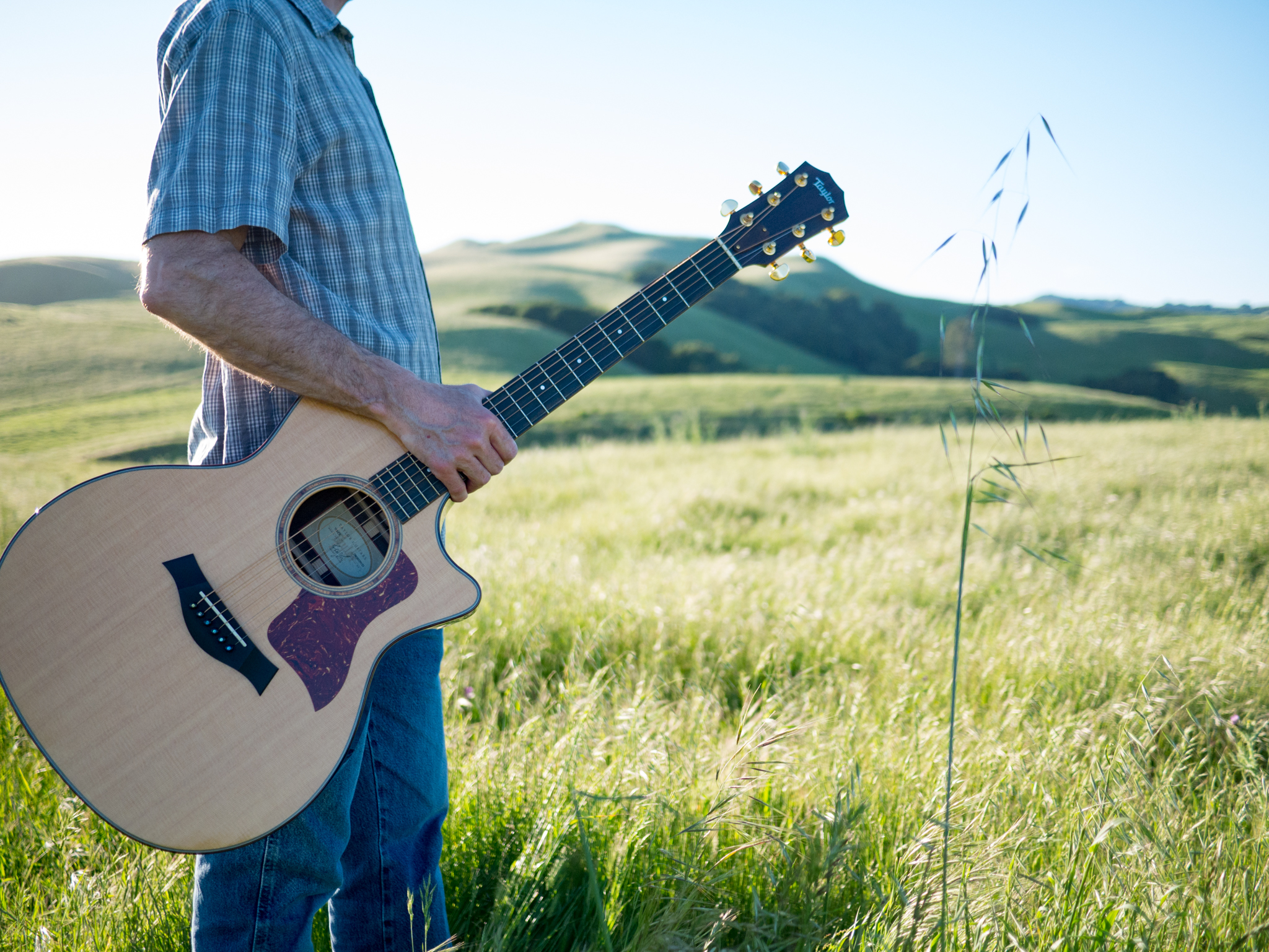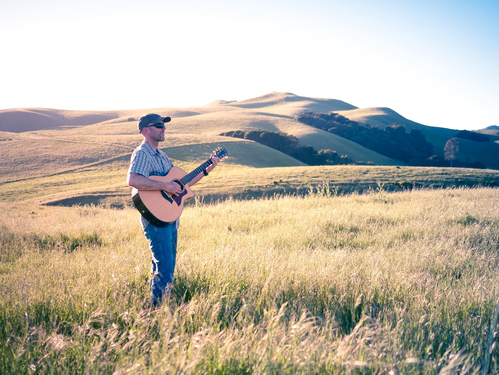 For my cover shot, I wanted to frame the picture almost directly into the sun. I’ve never tried that with this camera setup before, but I think it turned out really well. I was shooting wide open at f/1.7 for a nice soft background, and I had the shutter speed maxed out at 1/4000. I set the exposure metering mode to spot and pointed it at my shirt, and the Auto ISO ended up between 125 and 500. This left me and the guitar reasonably well exposed, while the landscape around me was overexposed for a soft sunset like appearance. The grass was super-green, but in some of the shots I amped up the golden amber-waves-of-grain vibe in Lightroom.